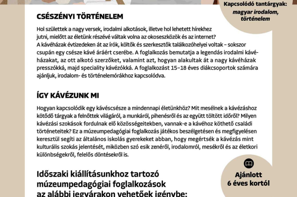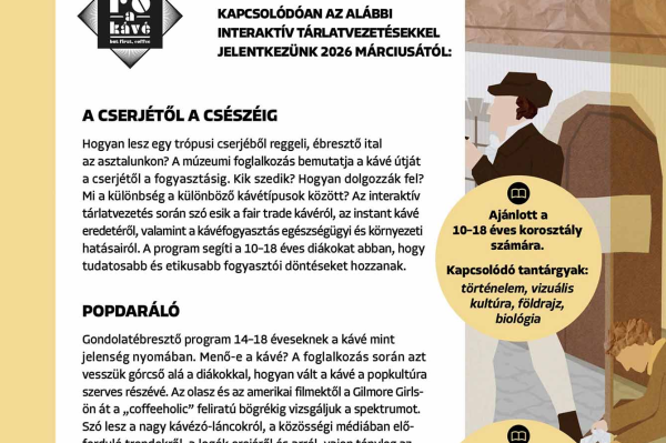 2026 márciusában az Elektrotechnikai Gyűjtemény ad otthon az új, Fő a kávé című időszaki tárlatunknak. Négy olyan múzeumpedagógiai órát kínálunk az általános, közép- illetve szakiskolák számára, amelyek a kávézás kultúrtörténetét interakítvan és kreatívan járják körbe, illetve kiválóan beilleszthetőek az irodalom, történelem, vizuális kultúra, biológia, földrajz és médiaismeret órákba is.